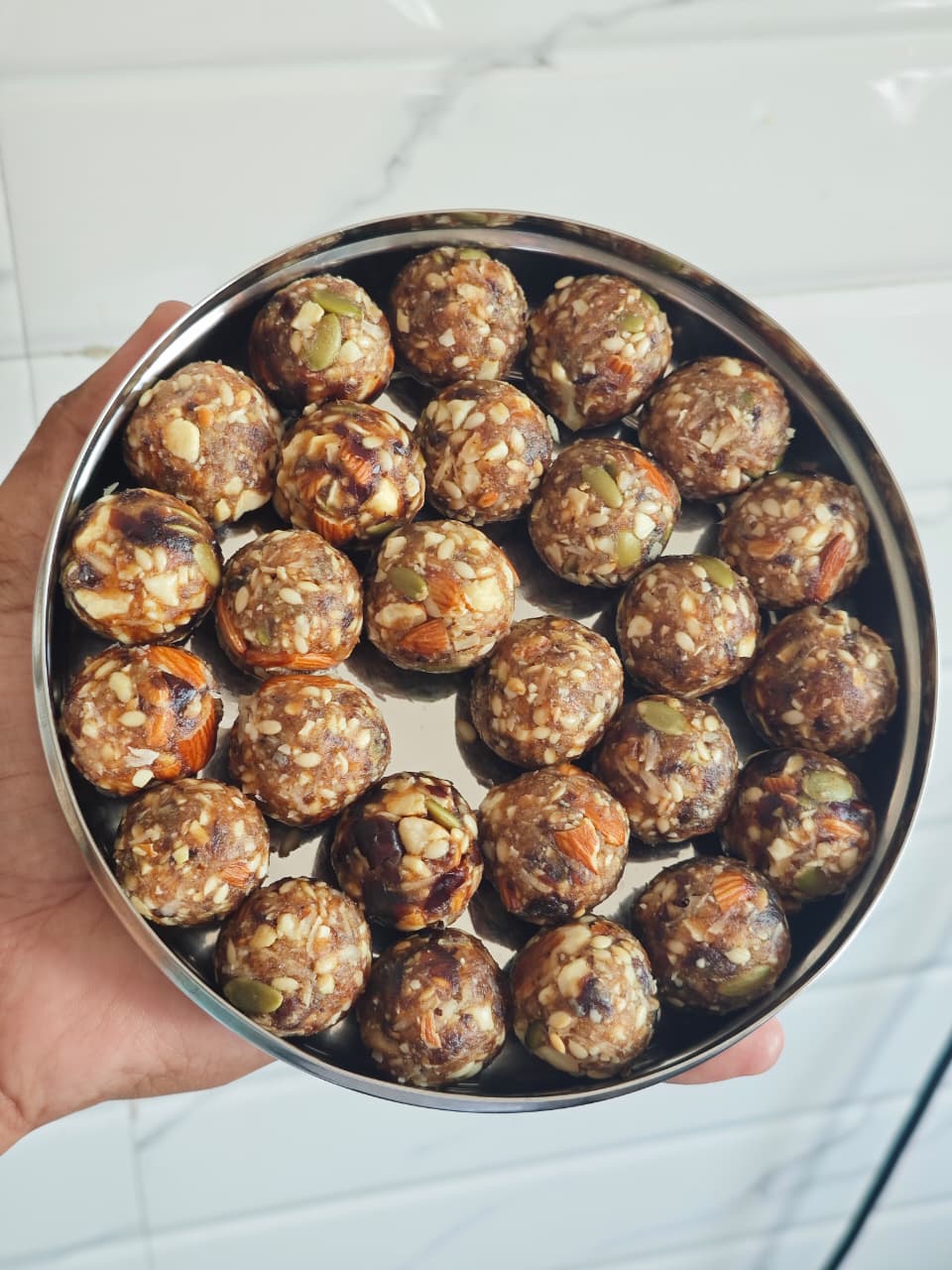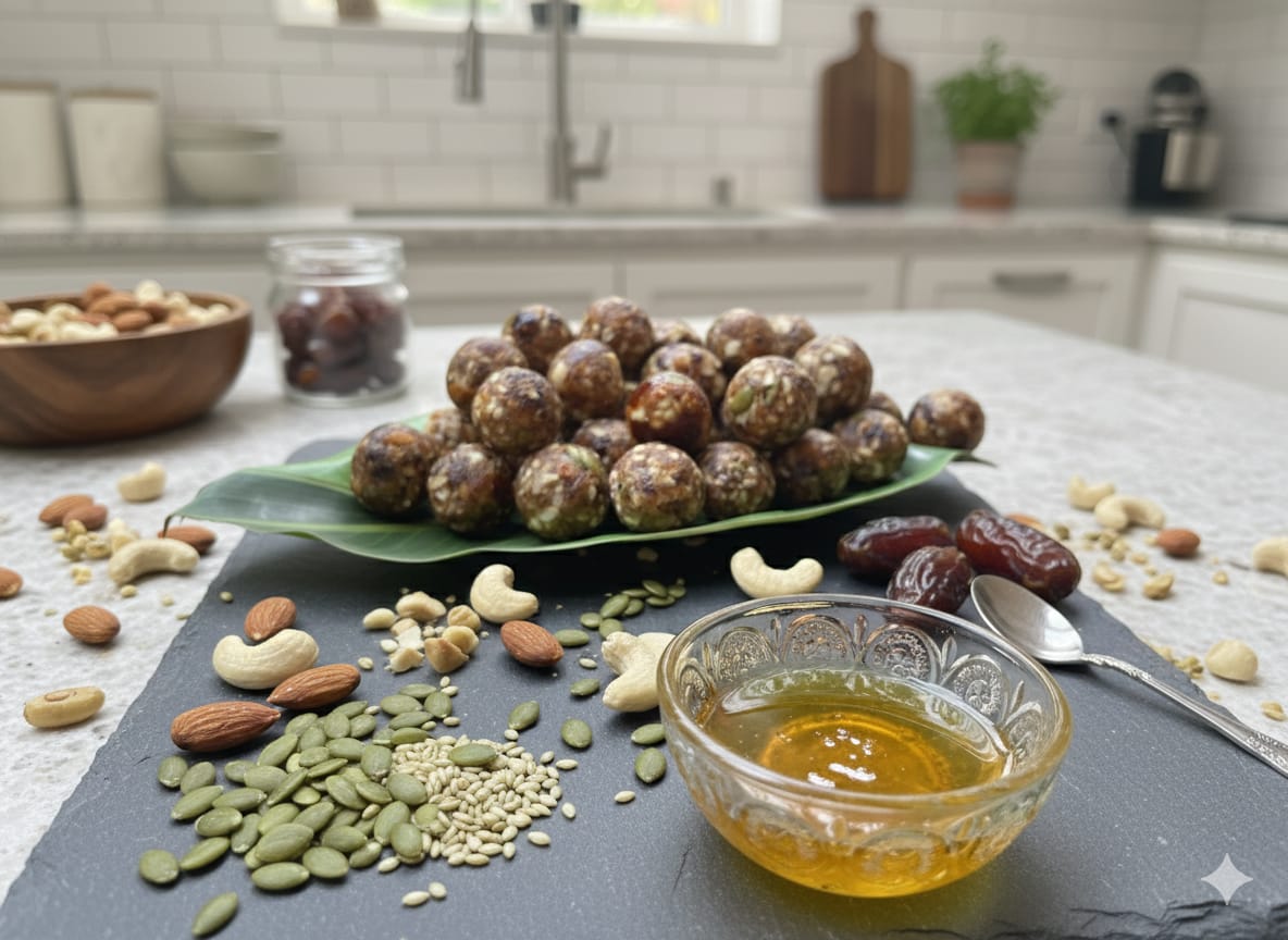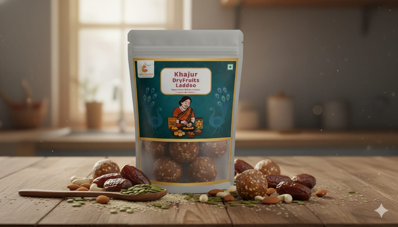 INGREDIENTS : Dates (Khajoor) As The Base, Along With A Combination Of Nuts Like Almonds, Cashews, And Pistachios. Common Additions For Binding And Flavor Are Ghee, Cardamom Powder, And Dried Coconut, While Other Ingredients Like Poppy Seeds, Figs, Raisins, And Watermelon Seeds Are Often Included.